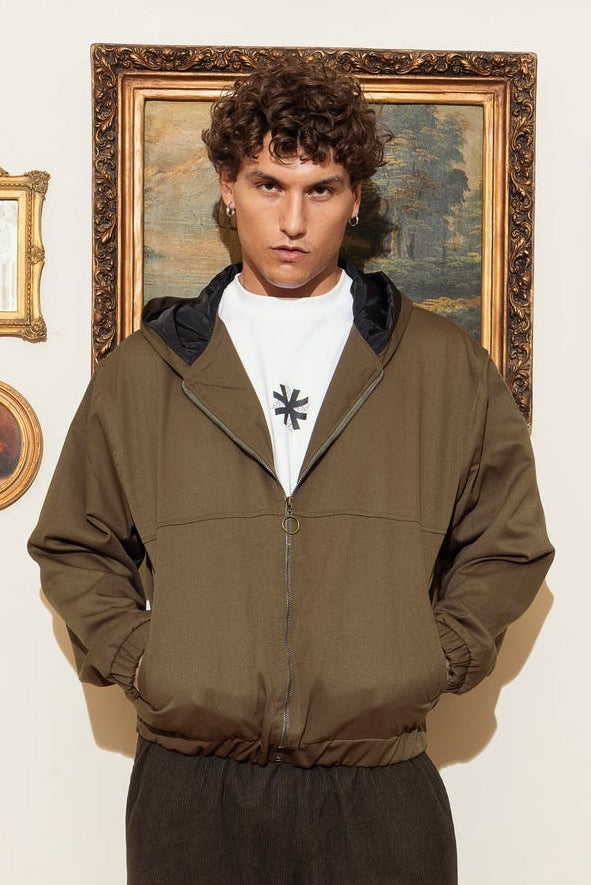 Features a dark golden zipper with a ring pull, two side pockets, a hood, and a structured, modern fit.